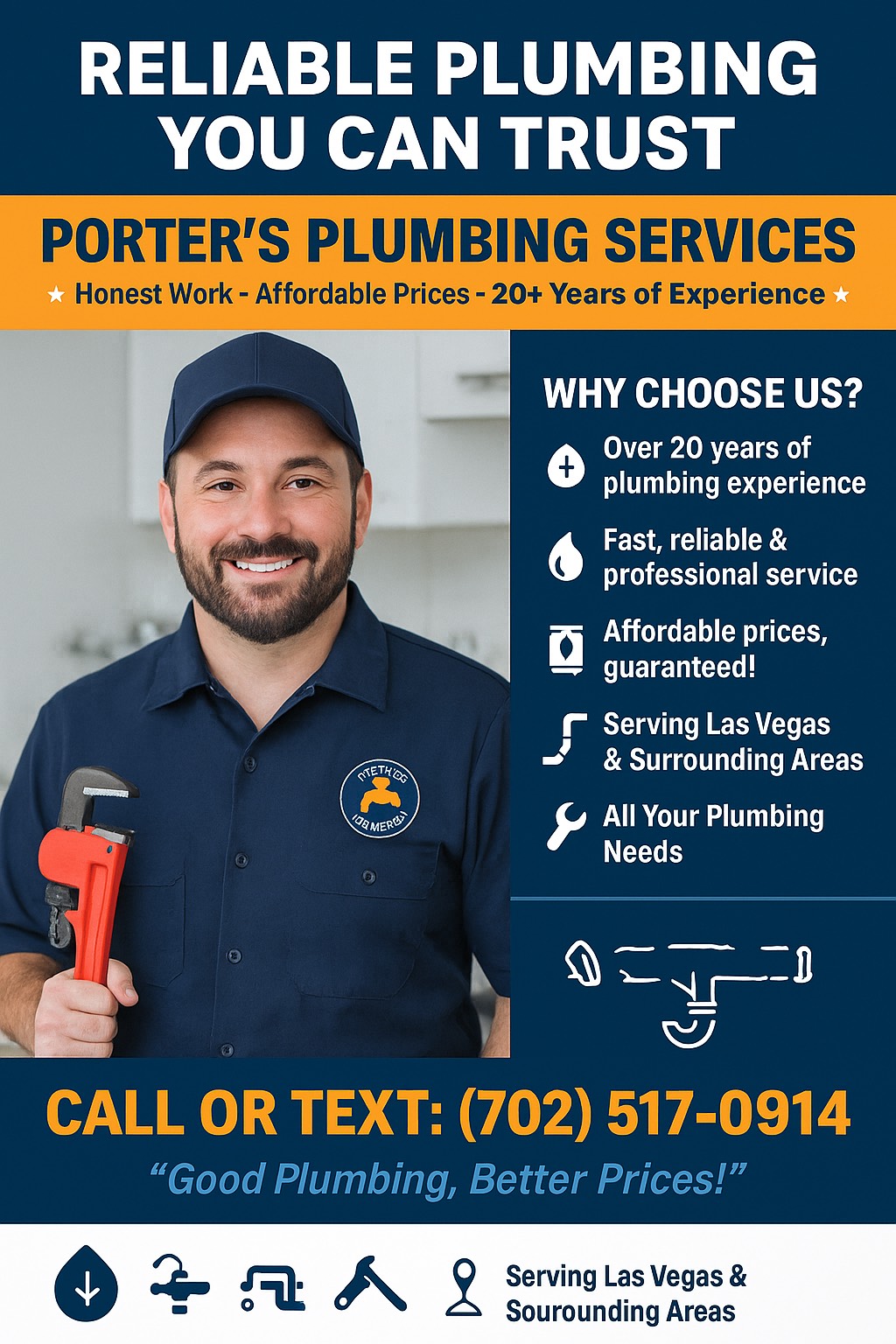At Porter’s Plumbing Services, we proudly offer a full range of plumbing solutions for homes and businesses in the Las Vegas area. With over 20 years of experience, we combine honest work, fair pricing, and reliable results.